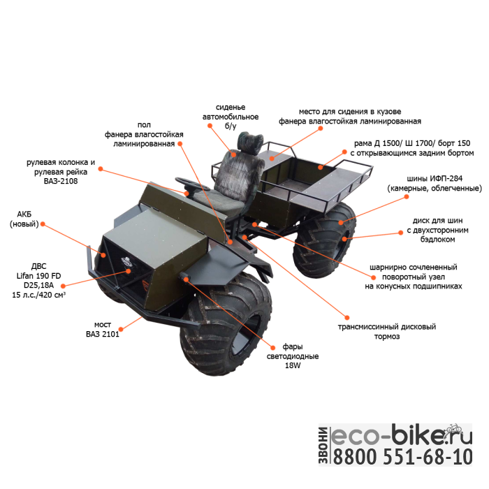 • Пол передней части вездехода и места для сидения в кузове: фанера ламинированная, влагостойкая